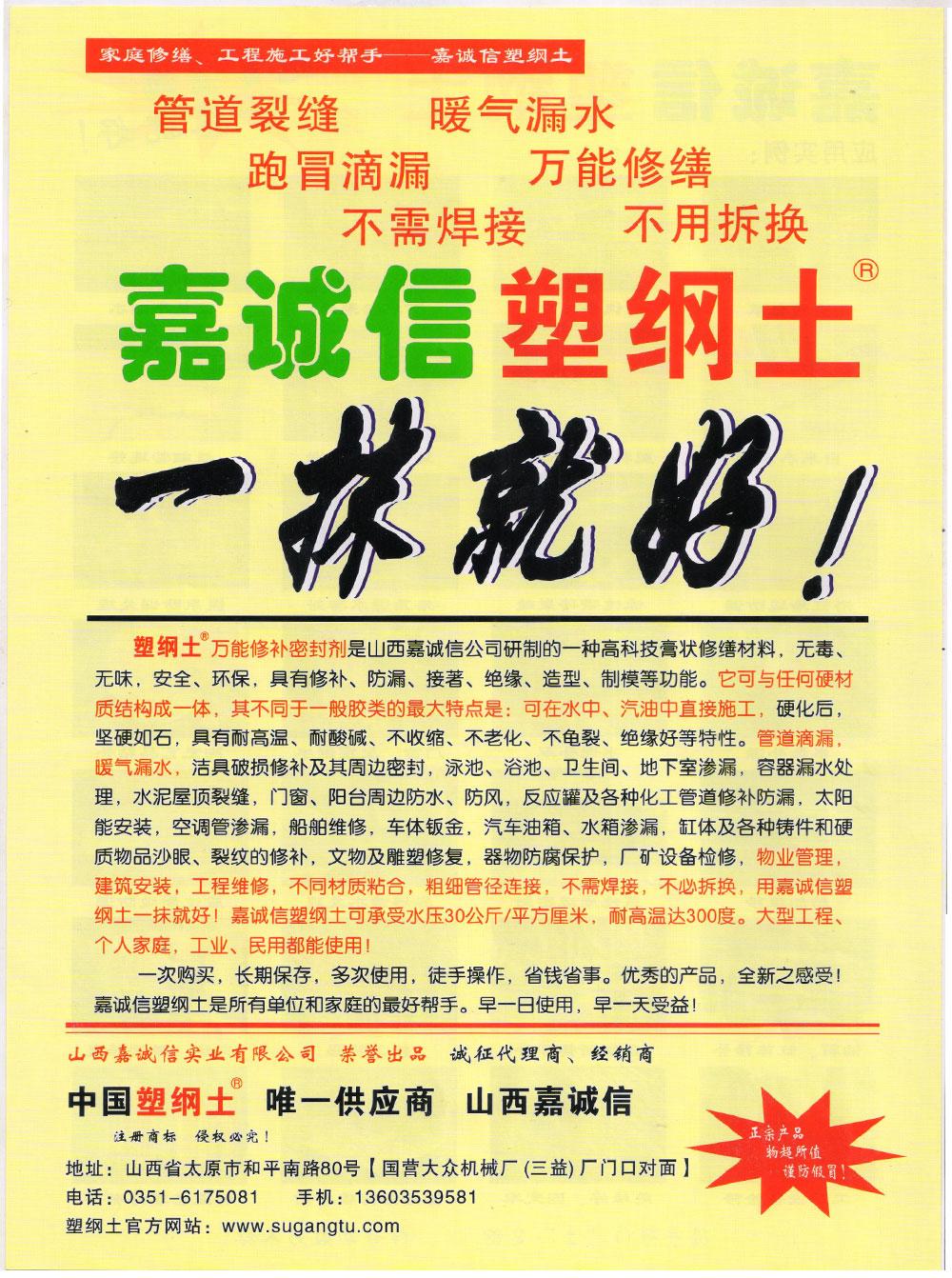 山西嘉誠信實業(yè)有限公司多年來,一直致力于“塑綱土”(國家注冊商標)修補密封劑在我國的推廣、應用和研究,用戶遍布各地。長期以來,山西嘉誠信實業(yè)有限公司投入大量人力、物力和財力,通過各種媒體及其它方式對”塑綱土”品牌進行市場推廣和大力宣傳,使“塑綱土”品牌在業(yè)內(nèi)享有相當知名度和影響力,深受廣大用戶的青睞和厚愛。