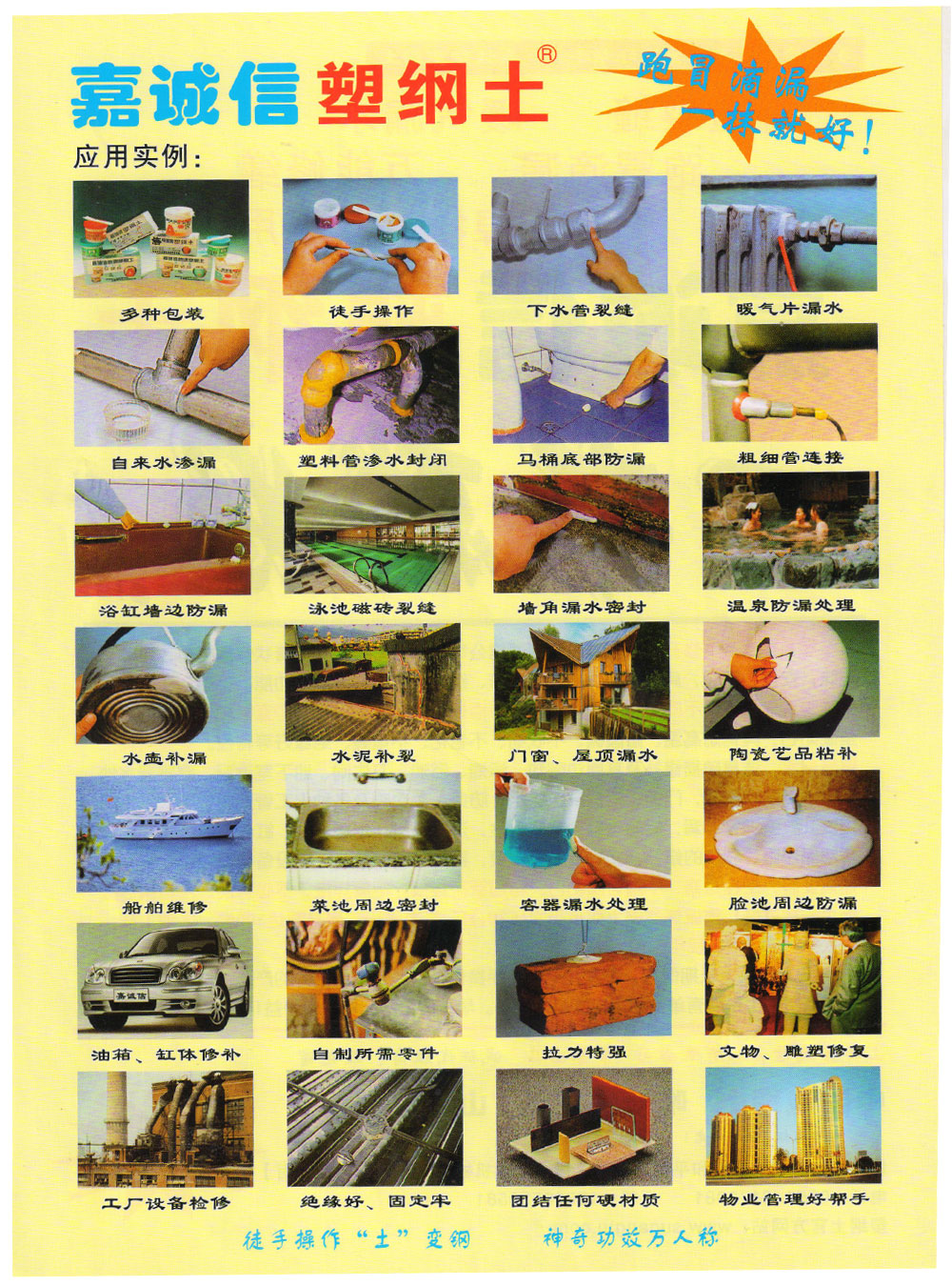 山西嘉誠信實業(yè)有限公司多年來一直致力于塑鋼土的研究、開發(fā),為塑鋼土在我國的推廣、應用與普及立下了汗馬功勞!嘉誠信早已成了塑鋼土的代名詞,嘉誠信就是塑鋼土,塑鋼土就是嘉誠信。跑冒滴漏滲就找嘉誠信,要買塑鋼土還找嘉誠信,已成為廣大用戶的共識!
